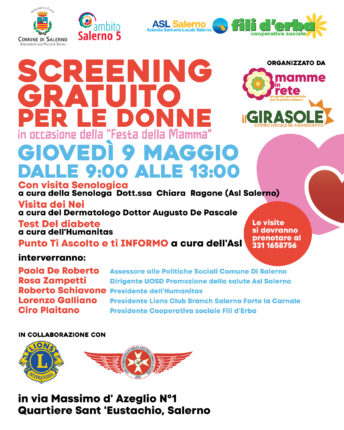 In occasione della Festa della Mamma, la Cooperativa Sociale Fili d’erba ha stipulato un protocollo di intesa con l’ASL di Salerno per un evento di SCREENING GRATUITO il giorno giovedì 9 maggio 2024 dalle 9:00 alle 13:00 presso il centro sociale ed aggregativo “Il Girasole” in via M. D’Azeglio 1 quartiere S. Eustachio a Pastena. L’iniziativa, pensata in occasione della festa della […]