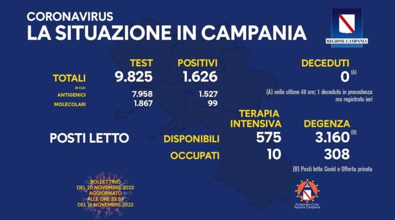 Sono 1.626 i positivi del giorno al Covid in Campania sui 9825 test effettuati, per un indice di contagio pari al 16,54%, in calo di un punto percentuale rispetto al dato di ieri (17,49%). Nessun deceduto nelle ultime 48 ore, cui va aggiunto uno risalente ai giorni scorsi ma registrato ieri dalla struttura Covid. Dieci […]