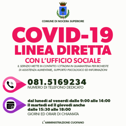 Prosegue in maniera costante l’attività di primo supporto ed assistenza a coloro che sono in quarantena o in isolamento fiduciario. La linea telefonica diretta, che corrisponde al numero 081.5169234 ed utilizzabile in questa fase negli orari di apertura degli uffici, è stata aperta da diversi giorni dall’Ufficio Politiche Sociali, su disposizione del sindaco di Nocera […]