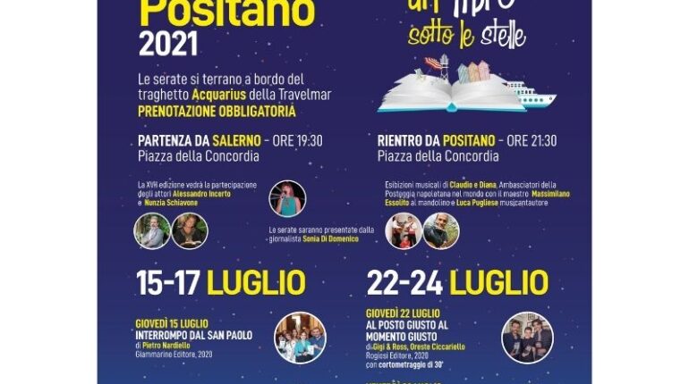 È ripartito ieri sera, 21 luglio, il traghetto dei libri della Tra.Vel.Mar. da Salerno con direzione Positano, per ospitare gli ultimi tre appuntamenti, della rassegna nazionale editoriale *Un libro sotto le stelle* con la presentazione del libro di Enrico Passaro responsabile dell’Ufficio del Cerimoniale di Stato e per le onorificenze, dal titolo “Non facciamo cerimonie! […]