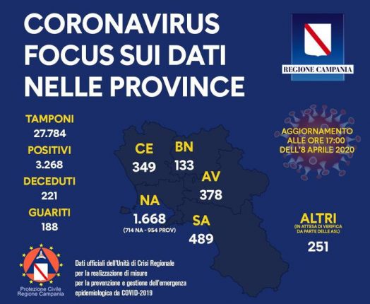 E’ di 3.268 positivi il bilancio delle persone contagiate dal Coronavirus in Campania secondo l’ultimo dato aggiornato alla mezzanotte scorsa e diffuso dall’unità di crisi regionale Covid 19. Il numero dei decessi è pari a 221, quello dei guariti 188 (di cui 111 totalmente guariti e 77 clinicamente guariti). Il totale dei tamponi effettuati ammonta […]