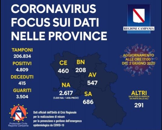 Due decessi e 32 guariti nelle ultime 24 ore in Campania: sono i dati dell’Unità di crisi della Regione Campania. Il totale dei positivi è pari a 4.834 persone su un 223.302 tamponi esaminati. Nel dettaglio sono 428 i deceduti mentre il totale dei guariti è di 3764 persone. Questo il riparto per provincia: Provincia […]