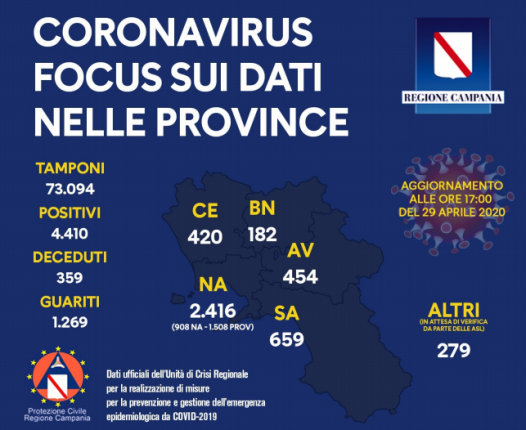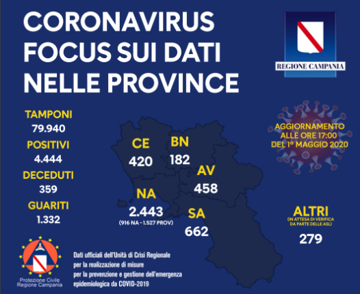 L’Unità di Crisi della Regione Campania ha appena comunicato la situazione aggiornata alle ore 23.59 di ieri, lunedì 4 maggio: Totale positivi: 4.518 Totale tamponi: 93.068 Totale deceduti: 369 Totale guariti: 1.619 (di cui 1590 totalmente guariti e 29 clinicamente guariti. Vengono considerati clinicamente guariti i pazienti che, dopo aver presentato manifestazioni cliniche associate all’infezione […]