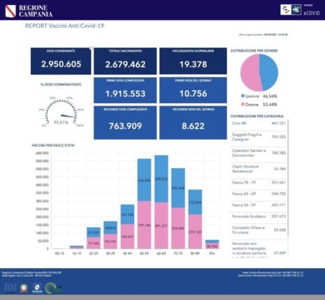 In Campania il dato aggiornato alle ore 12 di oggi conta ben 2.405.007 somministrazioni effettuate. Complessivamente sono stati vaccinati con la prima dose 1.737.623 cittadini, di questi 667.384 hanno ricevuto la seconda dose.