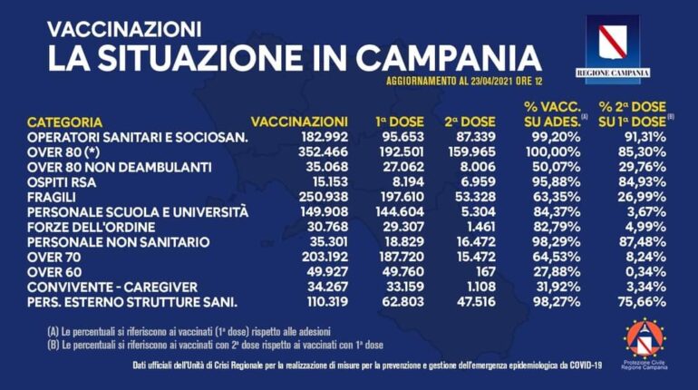 Secondo i dati dell’Unità di crisi della Regione Campania, ad oggi sono state somministrate 1.602.611; dosi di vaccino: oltre 30mila dosi in 24 ore. Complessivamente sono stati vaccinati con la prima dose 1.163.729 cittadini. Di questi 438.882 hanno ricevuto la seconda dose.