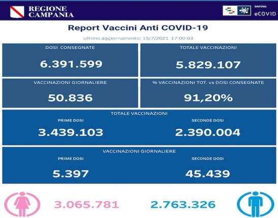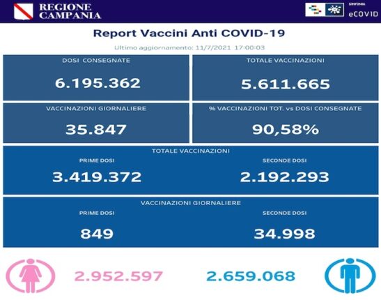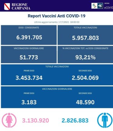 In Campania, ad oggi, complessivamente sono stati vaccinati con la prima dose 3.461.347 cittadini. Di questi 2.556.631 hanno ricevuto la seconda dose. Le somministrazioni effettuate sono state, in totale 6.017.978.