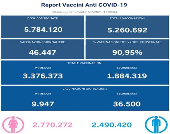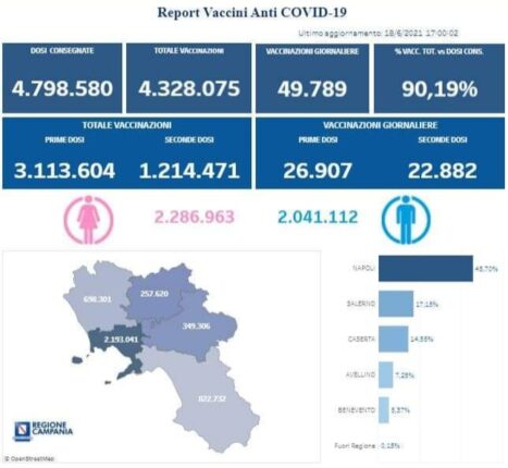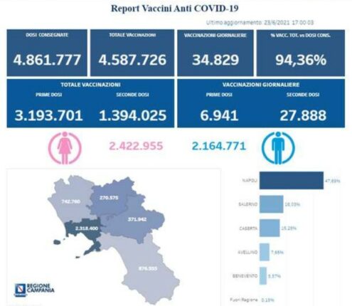 Alle ore 17.00 in Campanis sono stati vaccinati complessivamente con la prima dose 3.237.188 cittadini. Di questi 1.545.544 hanno ricevuto la seconda dose. Le somministrazioni effettuate sono state, in totale, 4.782.732.