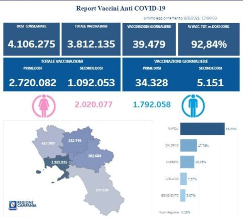Complessivamente in Campania sono stati vaccinati con la prima dose 2.720.082 cittadini. Di questi 1.092.053 hanno ricevuto la seconda dose. Le somministrazioni effettuate sono state, in totale, 3.812.135. I dati delle vaccinazioni in Campania, fa sapere l’Unità di Crisi, sono aggiornati alle 17.00 di oggi.