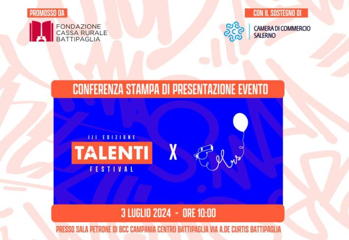Mercoledì 3 luglio 2024, alle ore 10:00, presso la Sala “Silvio Petrone” di Banca Campania Centro, in Via A. De Curtis a Battipaglia, sarà presentata la terza edizione del “Talenti Festival” promossa dall’Associazione Talenti, che si terrà nella Villa Comunale di Battipaglia in Via Belvedere/Via Clarizia dal 12 al 14 luglio.