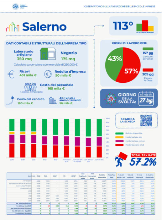 Il rapporto della CNA nello specifico rappresenta un’impresa individuale che utilizza un laboratorio artigiano di 350 mq e un negozio di proprietà destinato alla vendita di 175 mq con valori immobiliari di 500mila euro in tutti i comuni, ricavi per 431mila euro e un reddito d’impresa di 50mila. Il Presidente CNA Salerno, Antonio Citro si unisce all’appello del Presidente Nazionale Dario Costantini per il quale il livello di tassazione resta molto elevato e rappresenta un vincolo alla crescita. “Le imprese meritano un fisco più leggero, più semplice e più equo” ha detto Citro.