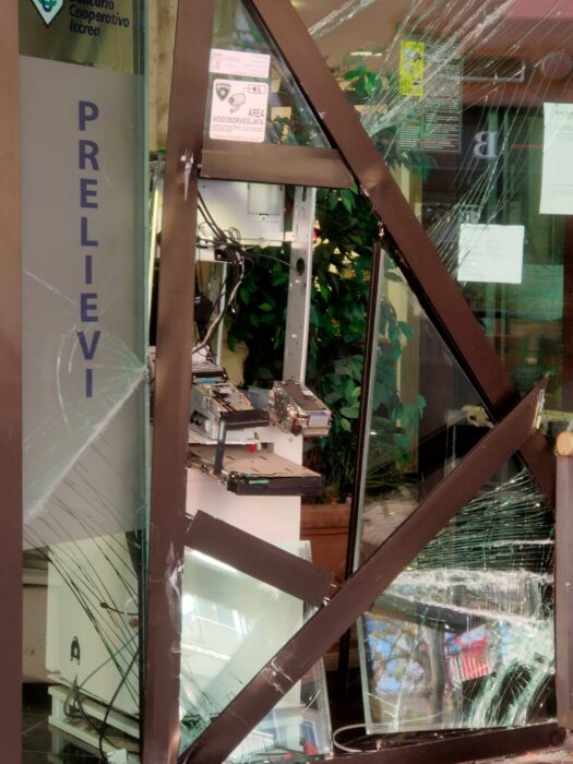 L’allarme è scattato alle 3:03, quando la centrale operativa dell’istituto di vigilanza Guardian ha rilevato dalle telecamere di sicurezza il tentativo di effrazione. Le immagini hanno mostrato un furgone bianco lanciato in retromarcia percorrendo perfino una breve scalinata per aumentare la spinta contro la vetrata blindata dell’istituto di credito, sfondandola. I malviventi, due uomini incappucciati, pare con guanti di colore arancione, visibili dalle immagini di videosorveglianza hanno poi agganciato il bancomat con una cinghia nel tentativo di strapparlo e caricarlo sul mezzo.