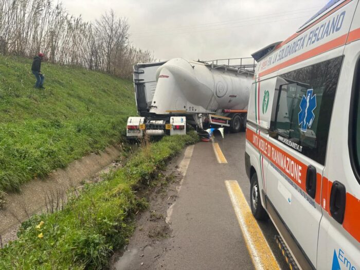 Per cause ancora da accertare, l’autista del mezzo ha perso il controllo andando a finire nel canale che delimita la carreggiata con la cabina di guida che si è girata su se stessa.