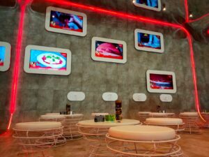 La Pizzeria 10.0, disegnata dall’architetto Simone Micheli è una galleria con duplice ingresso che proietta la dimensione del presente in un metafuturo ricco di suggestioni e soluzioni non comuni, che ribaltano le carte del gioco, dove non passa inosservata la presenza del cameriere-robot.