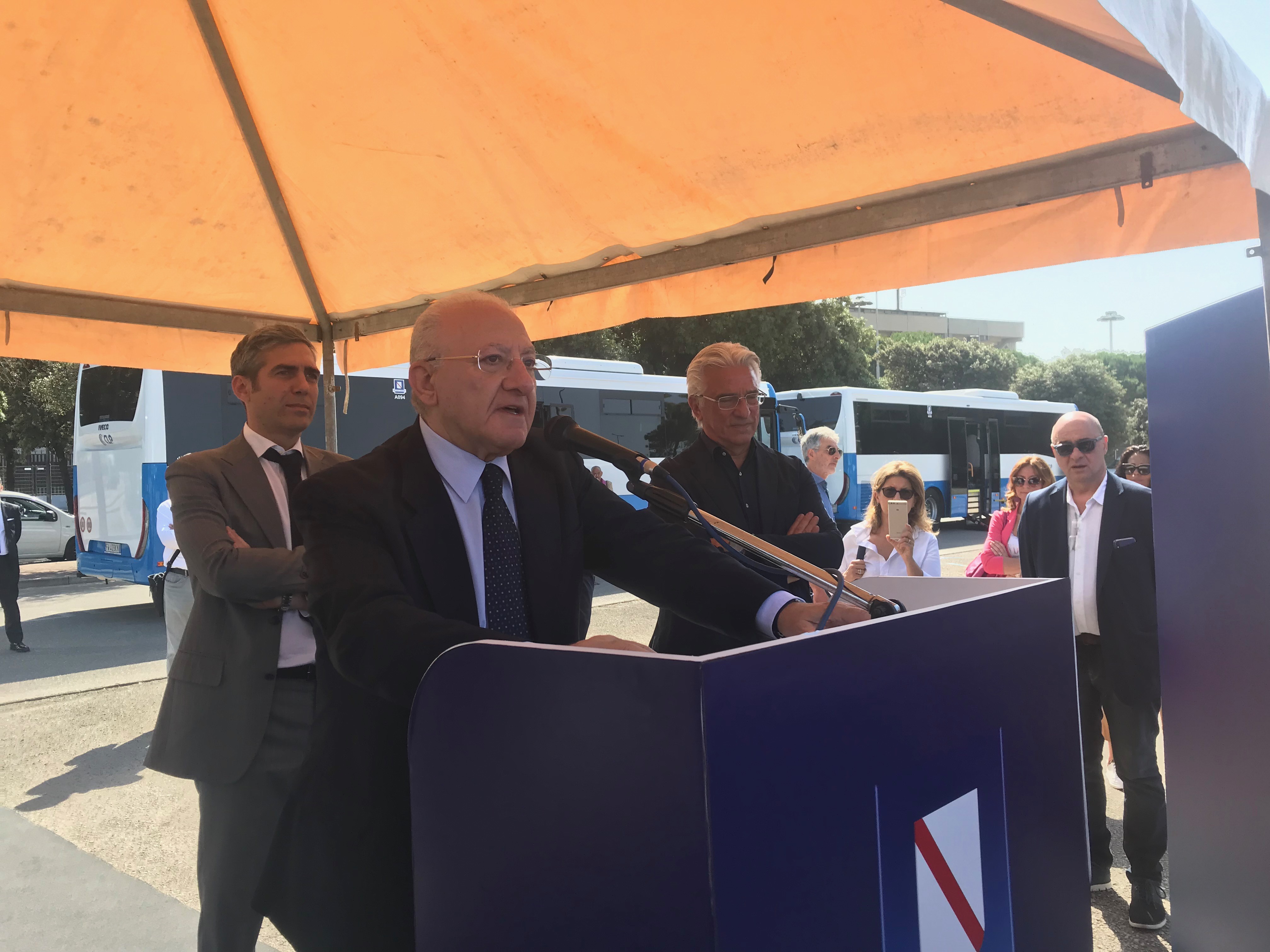 Quelli consegnati questa mattina sono solo i primi 52 autobus di un programma complessivo destinato al trasporto pubblico locale attraverso Il quale la regione Campania punta a rinnovare mille pullman nuovi entro il prossimo anno. Dotazioni tecnologiche e comfort ricrederanno più facile la vita dei pendolari che si muovono su gomma nell’intero territorio regionale, ma anche più sicura visto il sistema di video sorveglianza di cui saranno dotati i nuovi pullman. Ma nel presentare l’iniziativa il presidente della Regione Vincenzo De Luca, nella cerimonia che si è svolta allo stadio Arechi di Salerno con il consigliere