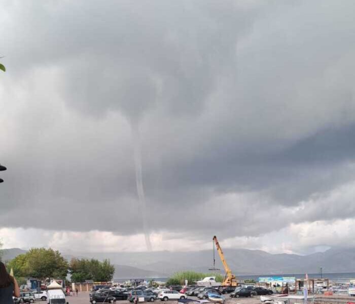 Una tromba d’aria si è formata in mare a Policastro Bussentino, scendendo dalle nubi nere e cariche di pioggia verso il mare.