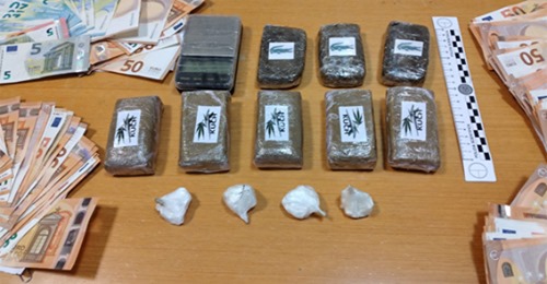 Il predetto, a seguito di perquisizione personale e locale, veniva trovato in possesso di: nr. 8 panetti di hashish del peso complessivo di gr. 800; di nr. 4 involucri contenenti sostanza stupefacente tipo cocaina, del peso complessivo di gr. 28.9; di nr. 1 bilancino di precisione; di nr. 1 block-notes contenente appunti riconducibili all’attività delittuosa nonché della somma di euro 16.150 (sedicimilacentocinquanta) in banconote di vario taglio, il tutto sottoposto a sequestro, a disposizione dell’Autorità Giudiziaria.