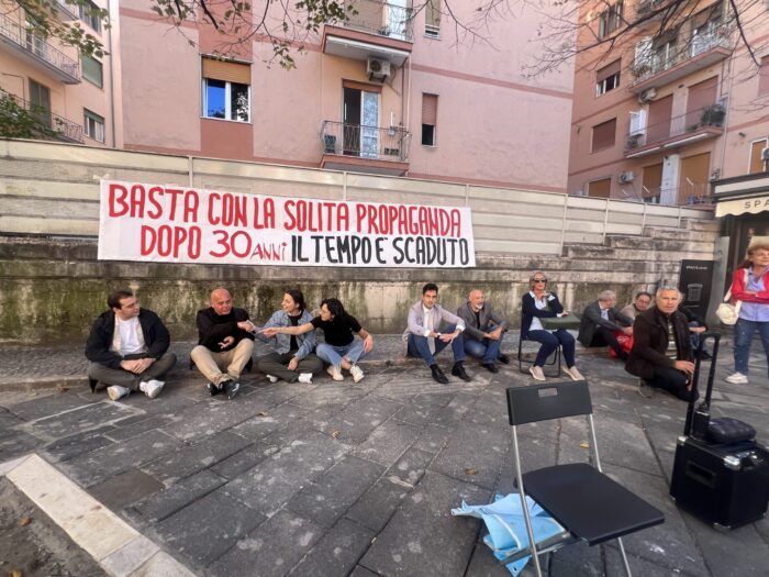 “Tutti seduti a terra”. Così, questa mattina, in piazzetta Monsignor Bolognini si sono riuniti i cittadini, le associazioni e alcuni consiglieri di opposizione per protestare in merito all’eliminazione totale delle panchine nell’area di fronte il Santuario della Madonna del Carmine dopo il “blitz” del governatore della Regione Campania, Vincenzo De Luca.