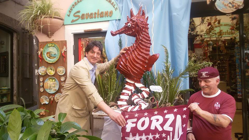 Un cavalluccio scolpito col cuore realizzato a mano in terracotta per celebrare la promozione in serie B della Salernitana. E’ alto 1.30 circa il cavalluccio marino simbolo dei granata pensato e fatto dall’artigiano salernitano nel cuore dei mercanti Giovanni Savastano che una ventina di giorni fa penso’, con tanto di cornetto scaramantico, di avviare la realizzazione dell’ippocampo gigante pensando vivere non solo la gioia della creazione in omaggio dei granata quanto per sostenere una nobile causa. Un cavalluccio con il cuore perchè Giovanni Savastano ha lanciato un appello a squadra, dirigenza, club, associazione e quanti lo vorranno per acquistare o mettere all’asta il cavalluccio per donare l’intero ricavato al reparto di pediatria oncologica dell’ospedale Ruggi di Salerno. Un cavalluccio che sta richiamando nel centro storico una grande attenzione anche fra i tanti turisti che anche questa mattina hanno voluto con un click fermarsi dinanzi al cavalluccio che Giovanni Savastano spera possa ancorarsi alla solidarietà per aiutare i piccoli pazienti.