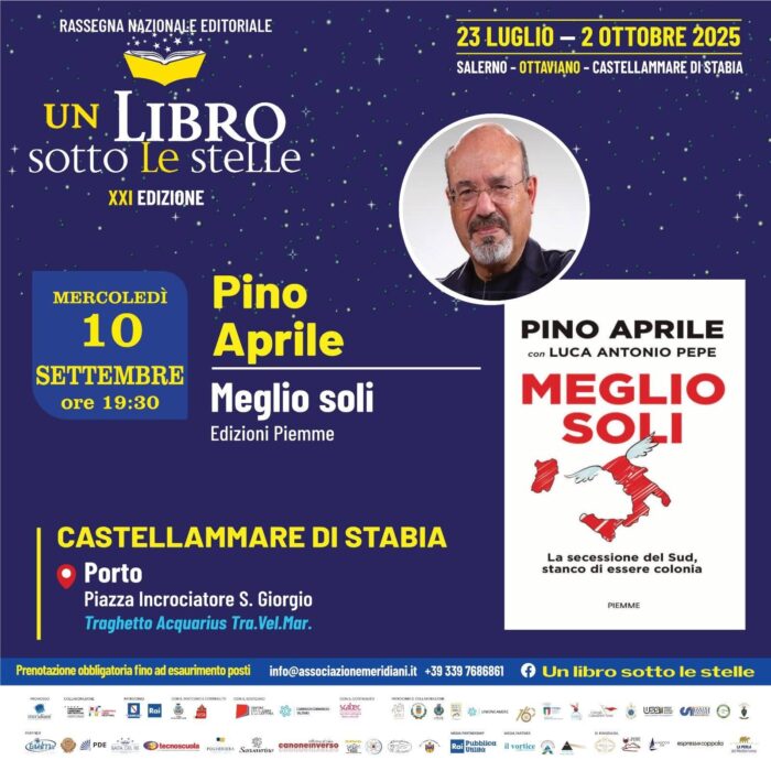 Giovedì 10 settembre, riparte il terzo ciclo di presentazioni di “Un libro sotto le stelle” ideato e promosso dall’Associazione Meridiani. Tre raffinati libri, tre best seller, saranno protagonisti sul traghetto “Blitz” della compagnia Alilauro Gru.So.N. La cultura prende così nuovamente il largo: tre giorni sospesi tra mare e parole, durante i quali gli ospiti avranno la possibilità di partecipare al tramonto a un reading e conversare con l’autore in un contesto unico e suggestivo. Un invito a rallentare, ascoltare e lasciarsi ispirare dalle storie, mentre il mare accompagna ogni parola. L’imbarco è previsto alle 19:00 nei pressi della Capitaneria di Porto Guardia Costiera di Castellammare di Stabia, rotta penisola Sorrentina, Punta Campanella e Scoglio di Rovigliano. Domani si salpa in compagnia di Pino Aprile che presenta il suo libro “Meglio soli”, un grido di ribellione alla condizione di subalternità in cui versa il Sud. Si prosegue giovedì 11 settembre con “Giancarlo Siani. Terra nemica” del giornalista Pietro Perone, il racconto dell’impegno di un ristretto gruppo di giornalisti, il “pool Siani” che ha inseguito la verità. La chiusura del terzo ciclo degli incontri è affidata a Lorella Di Biase, giornalista e autrice di programmi televisivi RAI, e della giornalista Monique Gregory Settanni con la biografia “Pino Settanni. Il sogno infinito”, un racconto a più voci sulla vita e sull’opera del noto fotografo Pino Settanni, partendo dai ricordi di familiari e amici di infanzia, fino alle testimonianze di personaggi del mondo del cinema e della cultura che lo hanno conosciuto e frequentato. Il varo degli appuntamenti letterari è affidato a Luigi Vicinanza, sindaco di Castellammare di Stabia, Vincenzo Ungaro, consigliere di Castellammare di Stabia, Gino Aveta, curatore della rassegna, Ada Minieri, vicepresidente dell’associazione Meridiani e il capitano di fregata Andrea Pellegrino, Comandante della Capitaneria di porto di Castellammare di Stabia. I saluti sono affidati a Franco Picarone, presidente della Commissione Bilancio della Regione Campania e Alfonso Giarletta, Event Manager Associazione Meridiani. La conduzione delle serate è a cura, come sempre, di Sonia Di Domenico, presenter dell’Associazione Meridiani con la collaborazione dello speaker Silvio Martino direttamente da Rai Radio Live Napoli. “Essere parte del progetto nazionale ‘Città che legge’, promosso da ANCI e dal Centro per il libro e la lettura – sottolinea Vicinanza – ci impegna a trasformare Castellammare di Stabia in una comunità sempre più attenta alla diffusione della cultura e del libro. La rassegna ‘Un libro sotto le stelle’ si inserisce in questo percorso virtuoso. In questo ciclo di appuntamenti, tre opere ci guidano in percorsi diversi ma complementari: con Pino Aprile riflettiamo sul destino e sull’autonomia del Sud d’Italia; con Pietro Perone e il suo libro dedicato a Giancarlo Siani rinnoviamo la memoria di un giovane cronista che ha scelto la verità a costo della vita, un appuntamento che arriva a pochi giorni dal 40esimo anniversario della sua scomparsa, mentre con Lorella Di Biase e Monique Gregory Settanni scopriamo l’universo creativo e umano di Pino Settanni. È un viaggio tra impegno civile, identità e arte, che arricchisce la nostra comunità e rafforza l’immagine di Castellammare come città viva e attenta alla cultura”. La XXI edizione di “Un libro sotto le stelle” si concluderà il 2 ottobre alle 11:00, alla Reggia di Quisisana di Castellammare di Stabia, inserita nell’edizione 2025 del Campania Libri Festival, a cura della Fondazione Campania dei Festival, dove sarà ricordato, per la Sezione Memory, Pino Scaccia, storico inviato della Rai ed ex caporedattore dei servizi speciali del Tg1. Giornalista in prima linea, nel suo lavoro ha saputo coniugare passione e rigore. La manifestazione si avvale del supporto di una fitta rete di enti e realtà culturali: Fondazione Campania dei Festival, Campania Libri Festival, Centro per il libro e la lettura, Camera di Commercio di Salerno, con il patrocinio di RAI, Regione Campania, SCABEC, ANCI Campania, Comune di Salerno, Ottaviano, città di Castellammare di Stabia, Parco Nazionale del Vesuvio, CONI Campania, Napoli Capitale Europea dello Sport 2026 e molti altri. Numerosi anche i partner tecnici e culturali, tra cui Canoneinverso, PDE, Istituti scolastici, associazioni, imprese locali e una media partnership di rilievo con RAI Pubblica Utilità e diverse testate giornalistiche e radiofoniche del territorio. Al termine di ogni appuntamento sarà offerto dall’organizzazione, presso il Circolo Velico Stabia, presieduto da Giuseppe Esposito, un ‘vin d’honneur’. L’arte culinaria e dolciaria è affidata alla Baita del Re Resort di Ottaviano con la collaborazione dei docenti e studenti dell’Istituto Alberghiero “Raffaele Viviani” di Castellammare di Stabia.