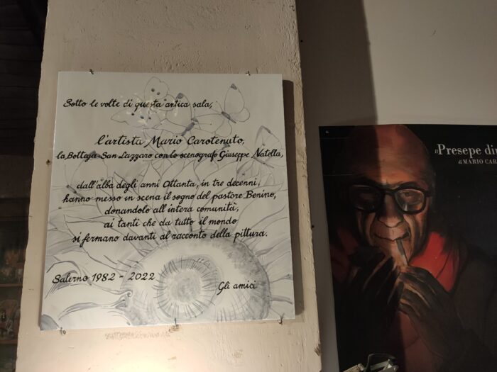 Stamani la cerimonia inaugurale alla presenza del Sindaco Vincenzo Napoli, del delegato alla cultura Ermanno Guerra, della famiglia Natella della Bottega San Lazzaro, del critico d’arte Massimo Bignardi, di don Michele Pecoraro parroco del Duomo di Salerno e dell’onorevole Alfonso Andria presidente Centro universitario europeo per i beni culturali. La targa stata realizzata dall’artista Franco Raimondi, ricorda “il sogno di Benino”, il progetto che dal nulla, con fatica e visionarietà, ha dato vita al Presepe, con la complicità dello scenografo Giuseppe Natella, che a Carotenuto è stato legato da una lunga amicizia e collaborazione professionale.