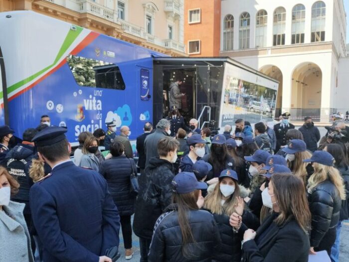 Sensibilizzazione i giovani sui rischi connessi all’utilizzo della rete internet.  E’ questo il contributo dato questa mattina in piazza Amendola dalla Polizia di Stato che stamani facendo tappa con il Truck “Una vita da social”, allestito con un’aula didattica multimediale ha permesso l’incontro di studenti, genitori e insegnanti con gli operatori della Polizia Postale e delle Comunicazioni che hanno spiegato i fenomeni connessi alla violenza in rete, analizzando, con un linguaggio diretto ed efficace, i pericoli presenti sui social network nonché le tematiche  del cyberbullismo. All’appuntamento, un’occasione importante per sensibilizzare e far conoscere un fenomeno che negli anni si è diffuso sempre di più, soprattutto tra gli adolescenti dove il bullismo e negli ultimi anni il cyberbullismo, trovano terreno fertile c’erano il prefetto di Salerno Francesco Russo,  il Vicario del Questore Pasquale Picone, sua eccellenza Monsignor Andrea Bellandi, altri rappresentanti istituzionali.