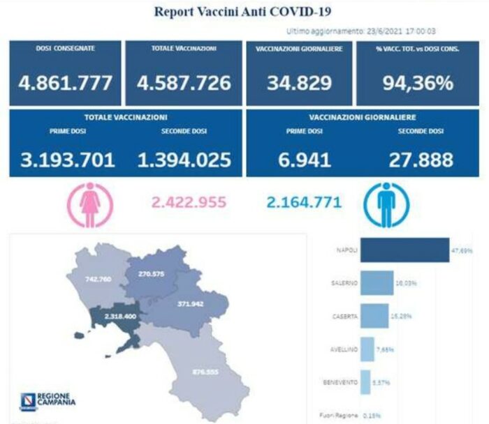 Le somministrazioni effettuate sono state, in totale, 4.587.726. I dati delle vaccinazioni in Campania, fa sapere l’Unità di Crisi, sono aggiornati alle 17.00 di oggi.