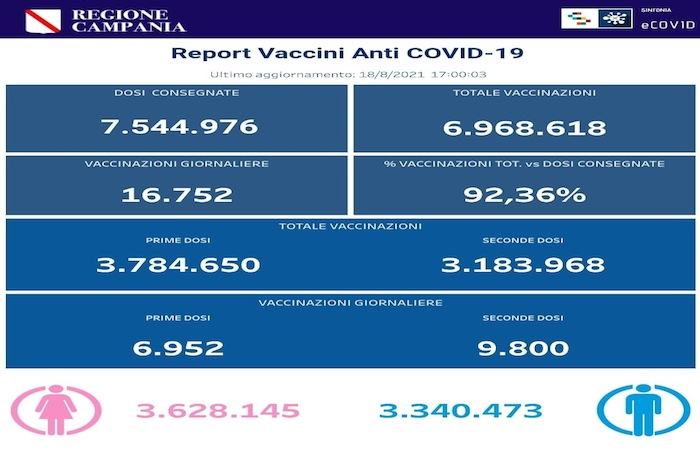 Il dato aggiornato delle vaccinazioni in Campania conta complessivamente 6.968.618 di somministrazioni effettuate.