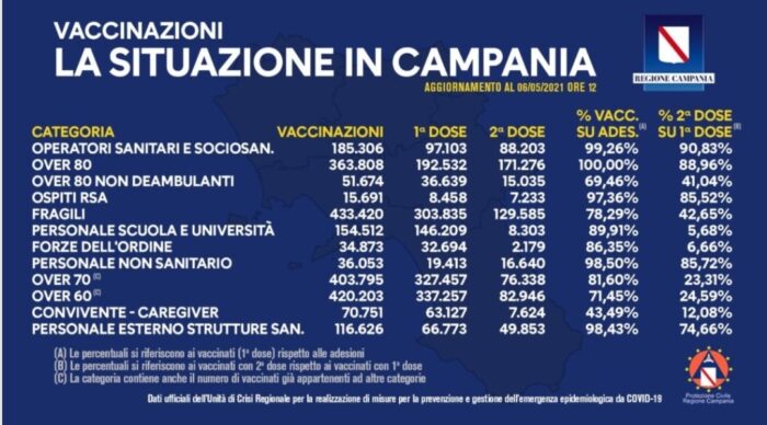 In Campania il dato aggiornato alle ore 12 di oggi conta complessivamente 2.062.675 di somministrazioni eseguite. I cittadini vaccinati con la prima dose sono 1.492.080, di questi 570.595 hanno ricevuto anche la seconda dose.