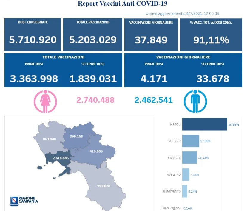 Il dato odierno delle vaccinazioni eseguite in Campania è di 5.203.029 somministrazioni.