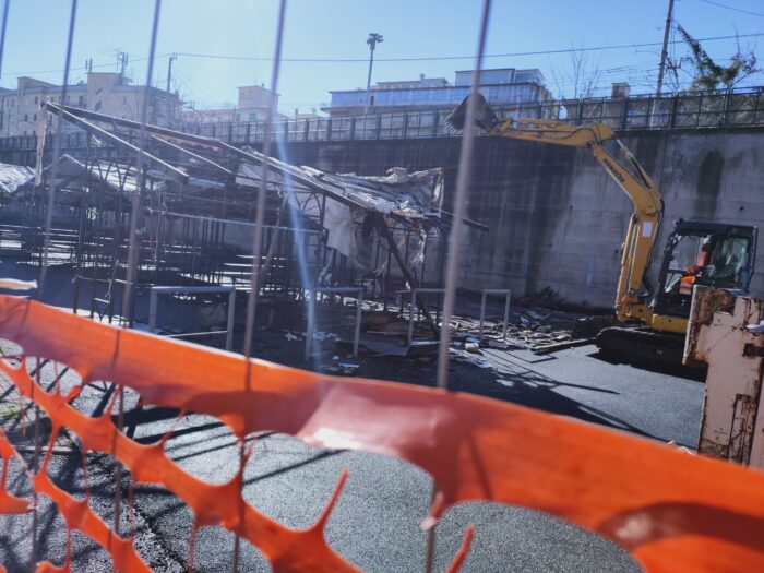 Ruspe in azione questa mattina in via Vinciprova per ripulire un ulteriore tratto della strada che costeggia la linea ferrata. Dopo l’abbattimento degli alberi stamani si è dato avvio allo smantellamento delle strutture in metallo che per anni hanno accolto nel
